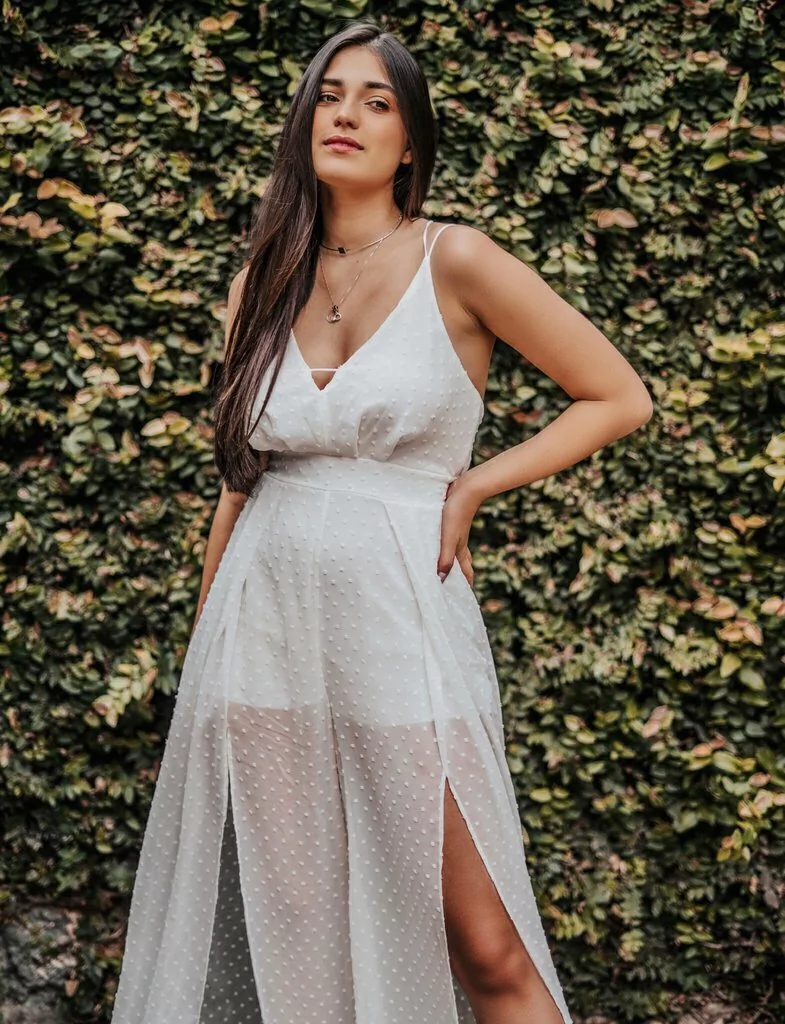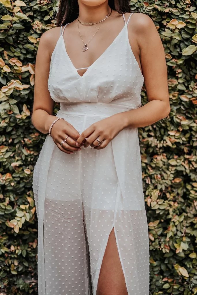 Macacão Cleo Fenda Branco traz um toque leve! Modelagem pantalona, o macacão possui detalhe de fenda na parte da frente além de bolinhas delicadas no tecido. Aposte no modelo para este verão e ano novo!